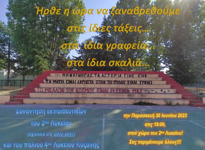 Ήρθε η ώρα να ξαναβρεθούμε  στις ίδιες τάξεις… στα ίδια γραφεία… στα ίδια σκαλιά την Παρασκευή 30 Ιουνίου στις 19.00 στο χώρο του 2ου Λυκείου Κοζάνης.
