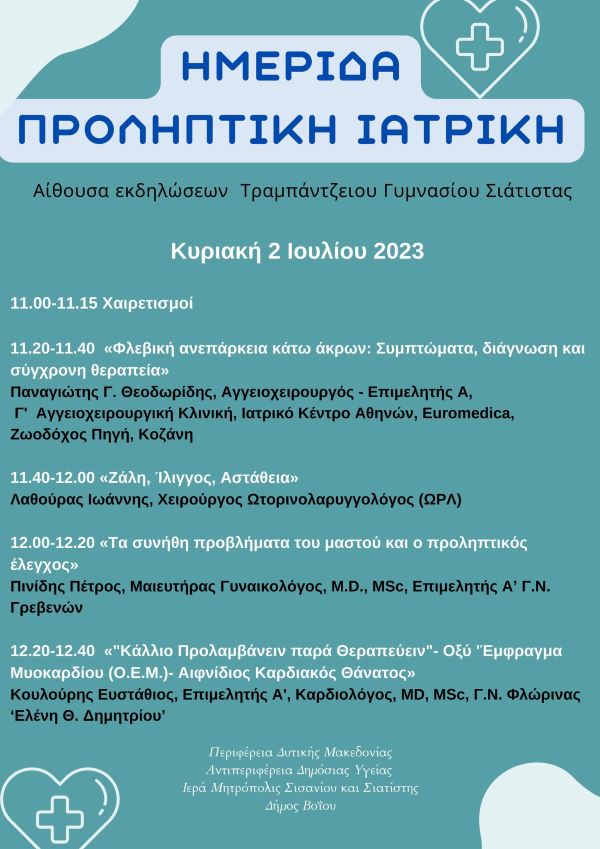 Βόιο 30/06/2023 Αντιπεριφέρεια Δημόσιας Υγείας: Ημερίδα με θέμα «Προληπτική Ιατρική» στη Σιάτιστα 0 Ημερίδα με θέμα την ‘Προληπτική Ιατρική’, θα πραγματοποιηθεί στην Αίθουσα Εκδηλώσεων του Τραμπάντζειου Γυμνασίου Σιάτιστας, την Κυριακή 2 Ιουλίου.