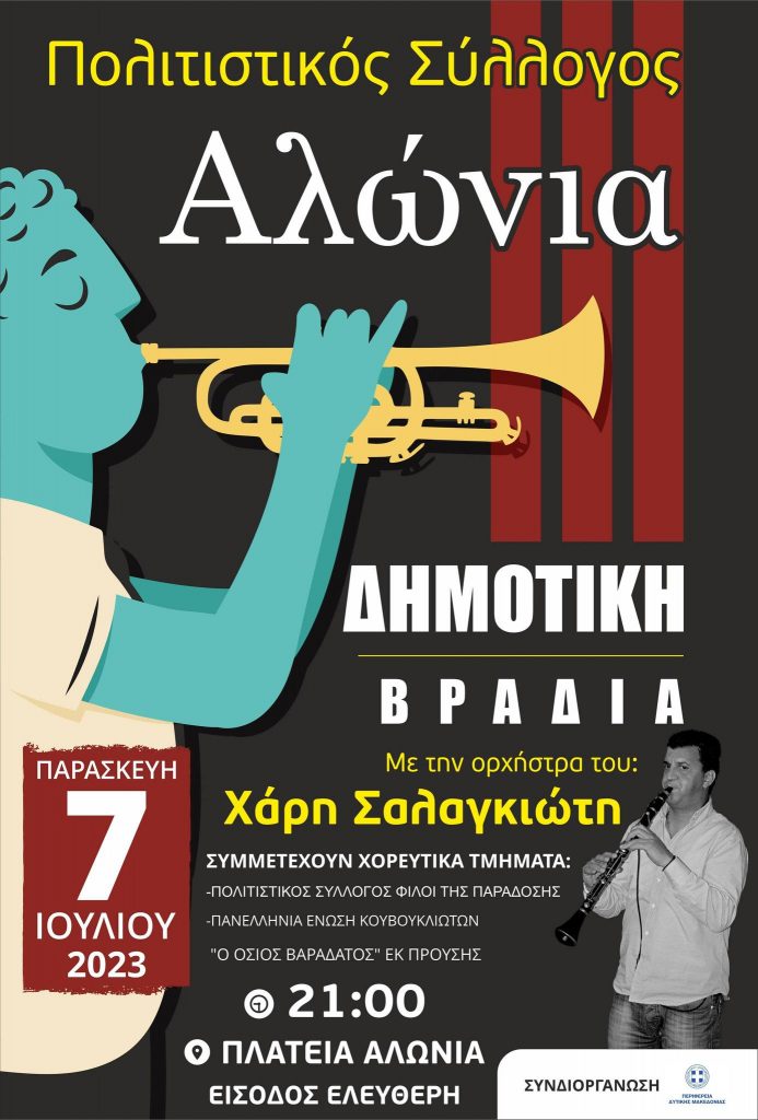 Ο Πολιτιστικός Σύλλογος Αλώνια σας καλεί στο ετήσιο καθιερωμένο γλέντι του που θα πραγματοποιηθεί στη πλατεία Αλώνια, Παρασκευή 7 Ιουλίου και ώρα 21:00 με την ορχήστρα του Χάρη Σαλαγκιώτη. Συμμετέχουν χορευτικά τμήματα: