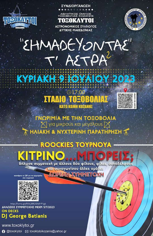 Στα πλαίσια των καλοκαιρινών μας δράσεων ο Α.Ο.Τ. “Τοξόκλυτοι Κοζάνης” για δεύτερη χρονιά σας προσκαλεί στη συνδιοργάνωση με τον Αστρονομικό Σύλλογο Δυτικής Μακεδονίας την Κυριακή 9 Ιουλίου στις 17.00 η ώρα στο ανοιχτό γήπεδο της Κάτω Κώμης Κοζάνης. Φέτος, εκτός από τη γνωριμία μικρών και μεγάλων με το άθλημα της τοξοβολίας, θα πραγματοποιηθεί ένα τουρνουά αρχαρίων , με συμμετοχή μόνο από ενήλικες (άνδρες & γυναίκες).