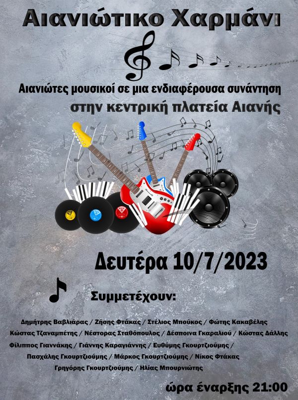 Κοζάνη 06/07/2023 Αιανιώτες μουσικοί σε μία ενδιαφέρουσα συνάντηση στην κεντρική πλατεία της Αιανής 0 Την Δευτέρα 10/7 θα πραγματοποιηθεί τελικά το ”Αιανιώτικο Χαρμάνι” που αναβλήθηκε την προηγούμενη βδομάδα λόγω καιρού. Μουσικά σχήματα που αποτελούνται από καλλιτέχνες της Αιανής σε μια συναυλία στην κεντρική πλατεία Αιανής.