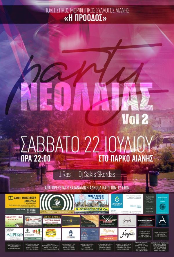 Το Σάββατο 22/7 ο ΠΜΣ Αιανής διοργανώνει το 2ο Party νεολαίας στο Πάρκο Αιανής.