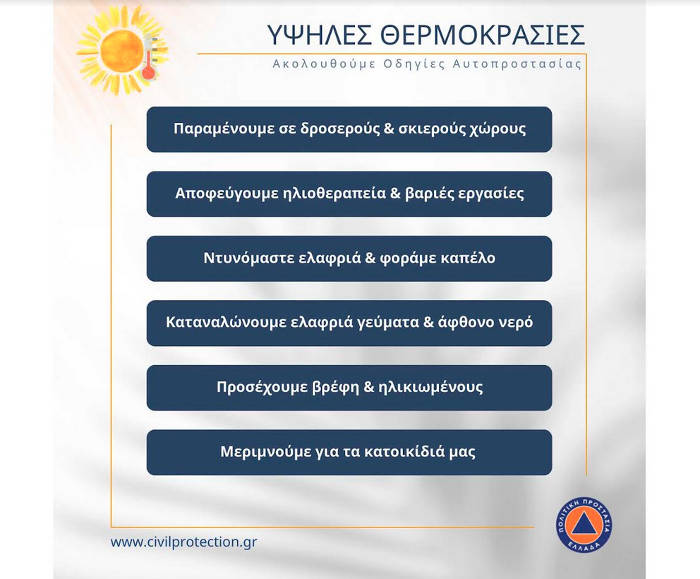 Σημειώνεται, ότι για την αντιμετώπιση του καύσωνα, οι πολίτες είναι απαραίτητο να εφαρμόζουν τις παρακάτω οδηγίες προστασίας:
