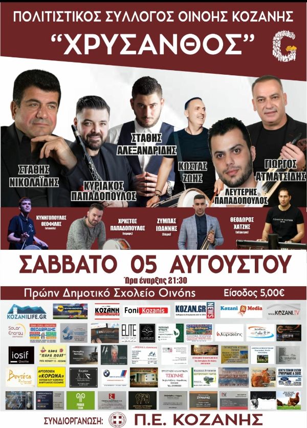 Το Διοικητικό Συμβούλιο του Πολιτιστικού Συλλόγου Οινόης “ΧΡΥΣΑΝΘΟΣ” σας προσκαλεί και φέτος στην πανηγυρική του εκδήλωση το Σάββατο 5 Αυγούστου 2023 στο προαύλιο του πρώην Δημοτικού Σχολείου Οινόης. Εγγύηση για την διασκέδασή σας αποτελεί το πλούσιο Καλλιτεχνικό μας Πρόγραμμα το οποίο πλαισιώνουν οι εξής:
