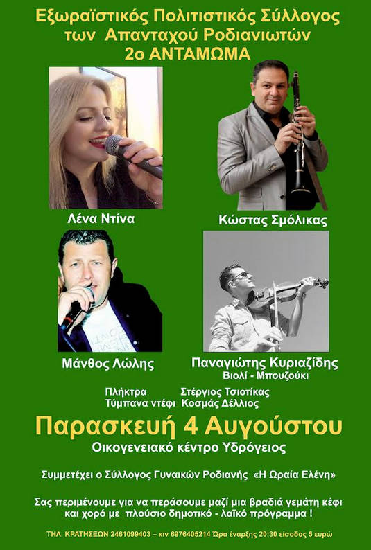Κοζάνη 31/07/2023 Το 2ο Αντάμωμα των απανταχού Ροδιανιωτών την Παρασκευή 4 Αυγούστου 0 Σας περιμένουμε όλους να παραβρεθείτε , φίλοι και συγγενείς σε ένα γλέντι που ετοιμάσαμε όχι μόνο για τους Ροδιανιώτες αλλά και για όσους θέλουν να ξαναζήσουν από κοντά ένα παραδοσιακό γλέντι.
