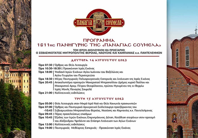 Με ανακοίνωσή τους, το Πανελλήνιο Ιερό Προσκύνημα και το Σωματείο «Παναγία Σουμελά» ενημερώνουν αναλυτικά για το πρόγραμμα της 1.611ης Πανηγυρικής Εορτής του Δεκαπενταύγουστου, που θα πραγματοποιηθεί όπως κάθε χρόνο στις 14 και 15 Αυγούστου.