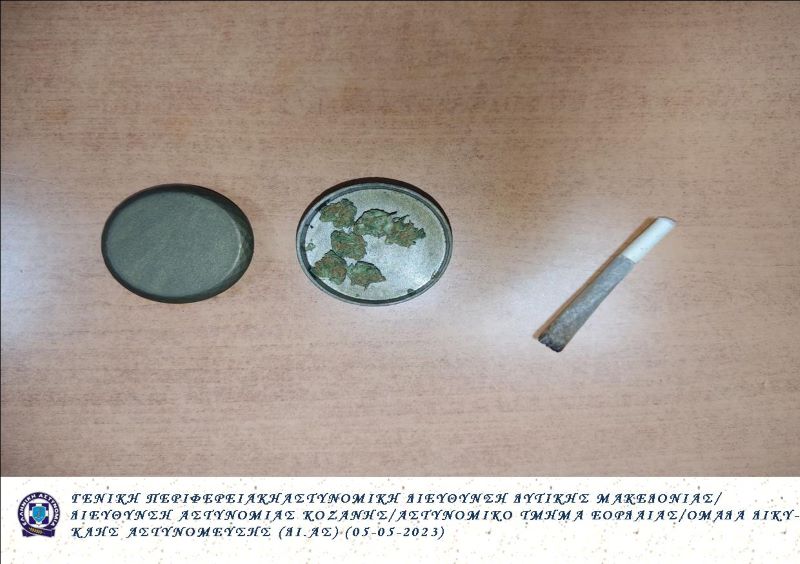 - στην πρώτη περίπτωση, συνελήφθη την 05-08-2023 τις πρώτες πρωινές ώρες στην Πτολεμαΐδα, από αστυνομικούς του Αστυνομικού Τμήματος Εορδαίας και του Τμήματος Ασφάλειας Εορδαίας, 23χρονος ημεδαπός, διότι στην κατοχή του βρέθηκαν και κατασχέθηκαν -1- αυτοσχέδιο τσιγάρο που περιείχε ακατέργαστη κάνναβη και -1- τρίφτης που περιείχε μικροποσότητα ακατέργαστης κάνναβης,