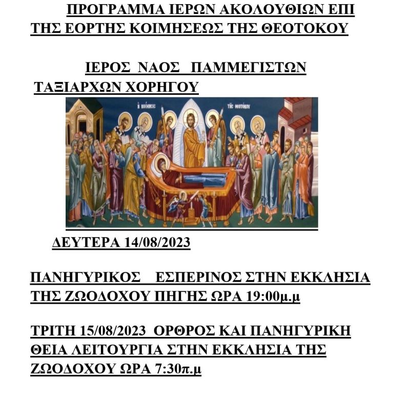 Εορτή Κοιμήσεως της Θεοτόκου: Ιερός Ναός Παμμεγίστων Ταξιάρχων Χορηγού- Δείτε το πρόγραμμα ακολουθιών