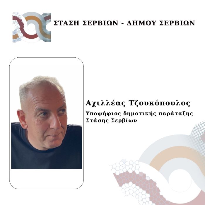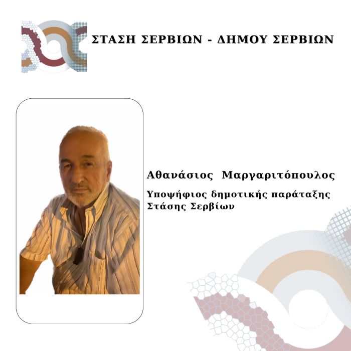 Σέρβια - Βελβεντό 15/08/2023 Δύο νέοι υποψήφιοι με τον συνδυασμό ‘Στάση Σερβίων’ 0 Δύο νέοι υποψήφιοι, οι Αθανάσιος Μαργαριτόπουλος και Αχιλλέας Τζουκόπουλος, με τον συνδυασμό ‘Στάση Σερβίων’ και υποψήφια Δήμαρχο Σερβίων Ρίτσα Σπυρίδου.