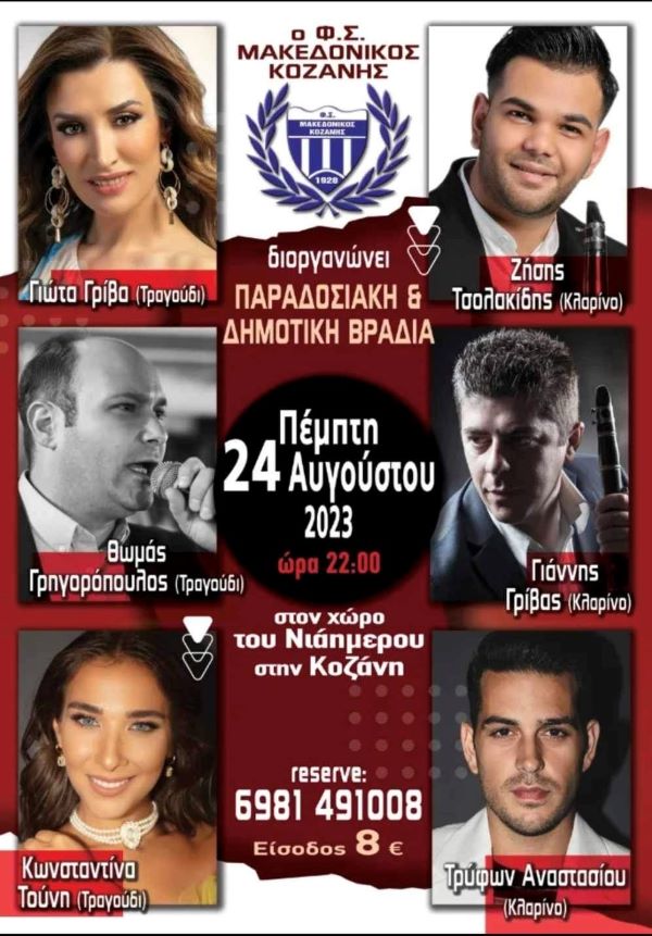Ο Φ.Σ. Μακεδονικός Κοζάνης διοργανώνει εκ νέου παραδοσιακή βραδιά στον χώρο του Νιάημερου Κοζάνης στις 24 Αυγούστου 2023 με τους  κορυφαίους καλλιτέχνες της δημοτικής  και παραδοσιακής σκηνής. Γιώτα Γρίβα τραγούδι, Κωνσταντίνα Τούνη τραγούδι, Θώμα Γρηγορόπουλο τραγούδι, και Ζήση Τσολακίδη κλαρίνο, Γιάννη Γρίβα κλαρίνο, και Τρύφωνα Αναστασίου κλαρίνο.