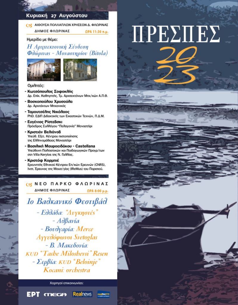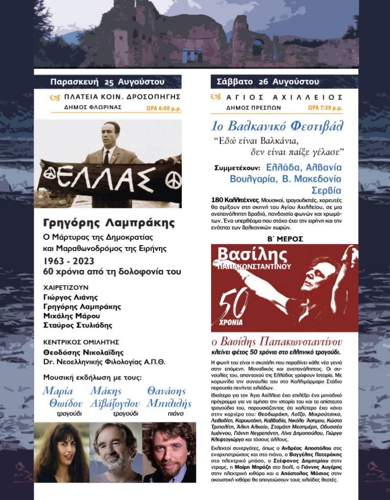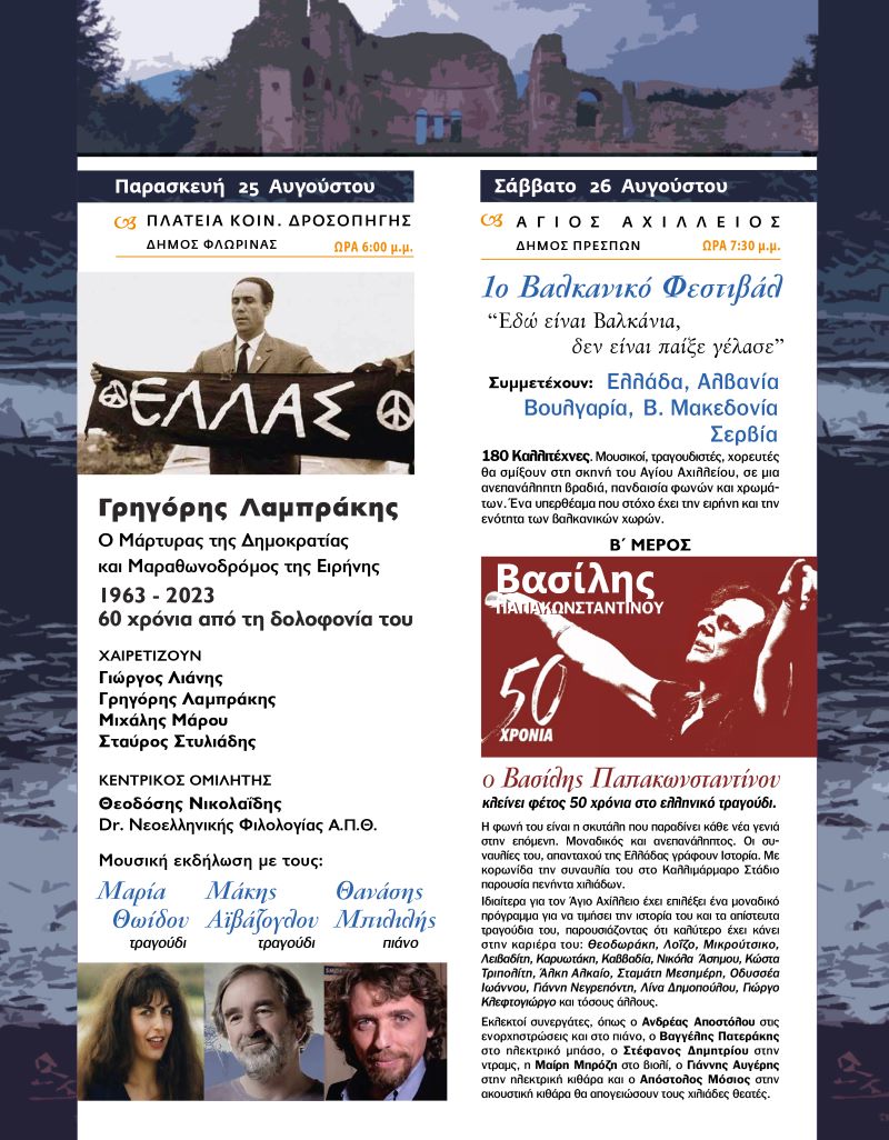 Στις Πρέσπες το Σάββατο 26 Αυγούστου θα ηχούν μόνο αηδόνια με κορυφαίο τον Βασίλη Παπακωνσταντίνου που έχει γράψει μεγάλη ιστορία στο ελληνικό τραγούδι. Που έχει τραγουδήσει εδώ πάνω σπάζοντας την σιωπή των βαλκάνιων. Η φωνή του είναι πια η φωνή της Αριάδνης που ένωσε πια στην Ελλάδα όλες τις γενιές από το 60 μέχρι σήμερα. Πρωτοφανές γεγονός. Το φεστιβάλ γίνεται στο ευρύτερο χώρο των Πρεσπών σε ένα αραβούργημα της φύσης, ένα επίγειο παράδεισο όπως τον έχει χαρακτηρίσει η UNESCO. Στο φεστιβάλ αυτό πέρασε και άφησε τεράστιο το χνάρι του ο μέγας Θεόδωρος Αγγελόπουλος. Το βήμα του δεν ήταν διόλου μετέωρο. Στις τρεις ταινίες έφερε την Φλώρινα και την Πρέσπα μπροστά. Το εγχείρημα είναι πολύ δύσκολο και για να πραγματοποιηθεί χρειάζεται, όπως πάντα και αυτό συμβαίνει και φέτος την βοήθεια της κυβέρνησης, ολόκληρου του πολιτικού κόσμου, του Στρατού, της Αστυνομίας, της Πυροσβεστικής και των αξιωματούχων όλης της Δυτικής Μακεδονίας. Ο πρωθυπουργός έχει δείξει άμεσο ενδιαφέρον δια του συνεργάτης Θανάση Νέζη. Η υπουργός του Πολιτισμού κα Λίνα Μενδώνη βοήθησε σθεναρά και είναι αυτή που θα εγκαινιάσει της φετινές εκδηλώσεις.
