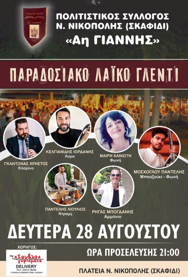 Κοζάνη 23/08/2023 Παραδοσιακό- λαϊκό γλέντι διοργανώνει ο Πολιτιστικός Σύλλογος Ν. Νικόπολης ‘Αη Γιάννης’ 0 Ο Πολιτιστικός Σύλλογος Ν. Νικόπολης Κοζάνης ‘Αη Γιάννης’, διοργανώνει παραδοσιακό – λαϊκό γλέντι στην πλατεία του χωριού.