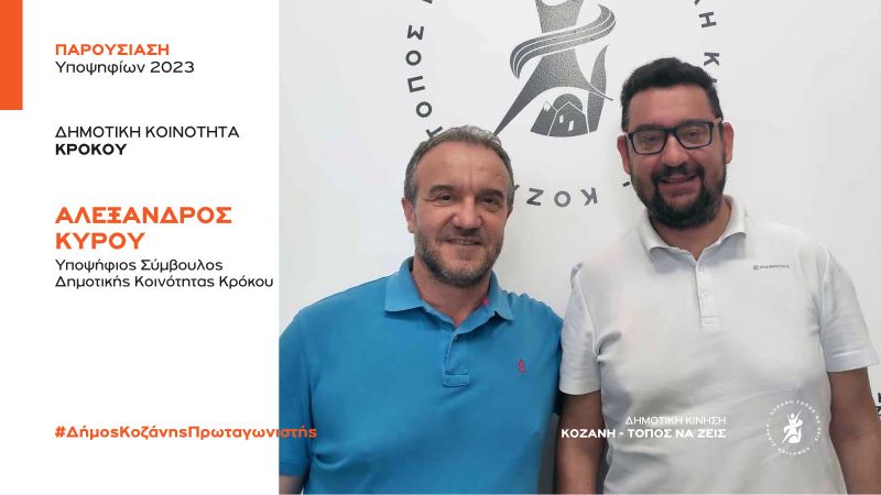 Η Δημοτική Κίνηση «Κοζάνη Τόπος να Ζεις» καλωσορίζει με χαρά ως υποψήφιο σύμβουλο για την δημοτική Κοινότητα Κρόκου  τον Αλέξανδρο Κύρου.