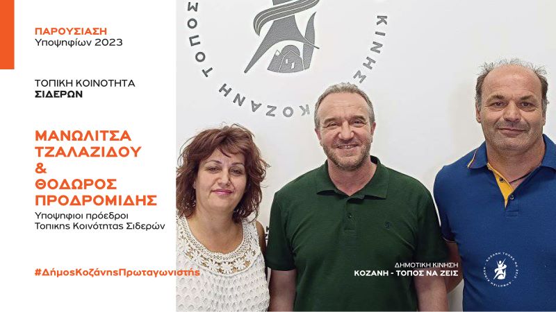 Η Δημοτική Κίνηση «Κοζάνη Τόπος να Ζεις» καλωσορίζει με χαρά ως υποψήφιους Προέδρους για την τοπική Κοινότητα Σιδερών  τον Θόδωρο Προδρομίδη και την Μανωλίτσα Τζαλαζίδου.