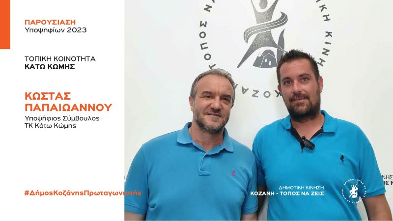 Η Δημοτική Κίνηση «Κοζάνη Τόπος να Ζεις» καλωσορίζει με χαρά ως υποψήφιο σύμβουλο για την τοπική Κοινότητα Κάτω Κώμης τον Κώστα Παπαϊωάννου.