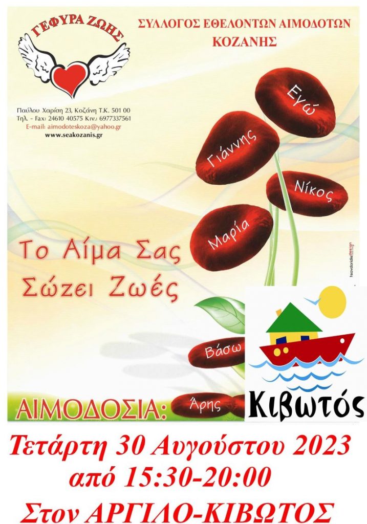 Η 25η Αιμοδοσία γίνεται την Τετάρτη 30 Αυγούστου 2023 από τις 15:30 – 20:00 στον Άργιλο, στο χώρο της ΚΙΒΩΤΟΥ Παιδιατρικό Κέντρο Αποθεραπείας-Αποκατάστασης, Διημέρευσης Ημερήσιας Φροντίδας Α.με Α με την συνεργασία της Κοινότητας Αργίλου, τον Α.Μ.Σ. Αναγέννηση Αργίλου και την Αιμοδοσία του Γ.Ν. Κοζάνης.