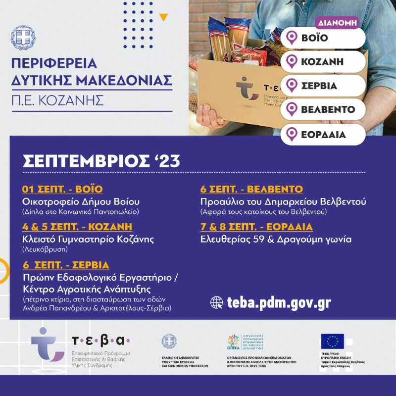 Η Περιφερειακή Ενότητα Κοζάνης ως επικεφαλής εταίρος της Κοινωνικής Σύμπραξης ΤΕΒΑ που έχει συσταθεί για το Νομό μας ανακοινώνει ότι θα πραγματοποιηθεί, σε συνεργασία με τους Δήμους Κοζάνης, Βοΐου, Εορδαίας, Σερβίων και Βελβεντού, διανομή τροφίμων του «Επιχειρησιακού Προγράμματος Επισιτιστικής και Βασικής Υλικής Συνδρομής ΤΕΒΑ» στους δικαιούχους του προγράμματος, τις παρακάτω ημέρες :