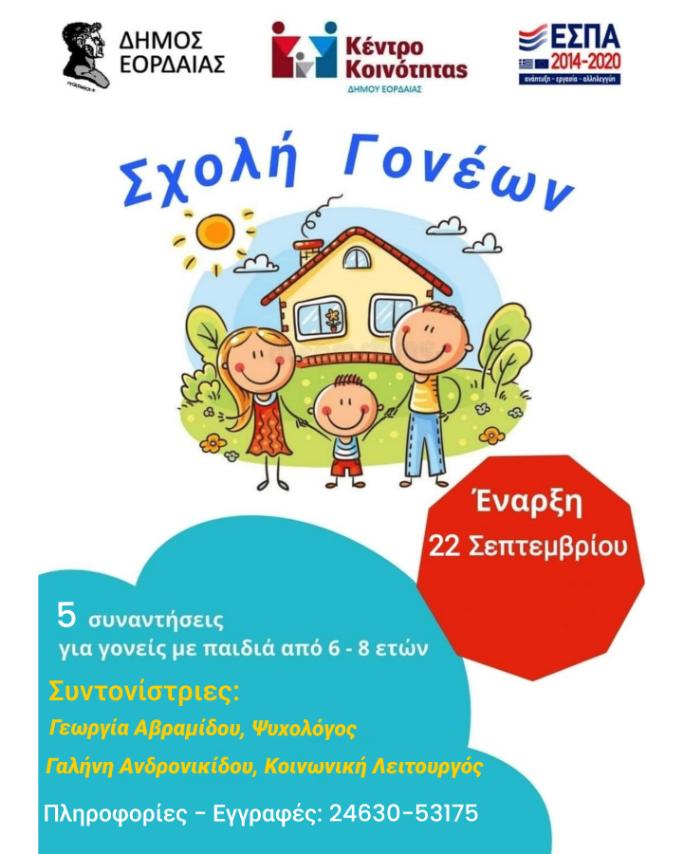 Ο Δήμος Εορδαίας, ο Αντιδήμαρχος Υγείας, Εθελοντισμού & Κοινωνικής Μέριμνας και το Κέντρο Κοινότητας της Διεύθυνσης Κοινωνικής Προστασίας, Παιδείας και Πολιτισμού Δήμου Εορδαίας, ανακοινώνουν την έναρξη λειτουργίας Σχολής Γονέων.