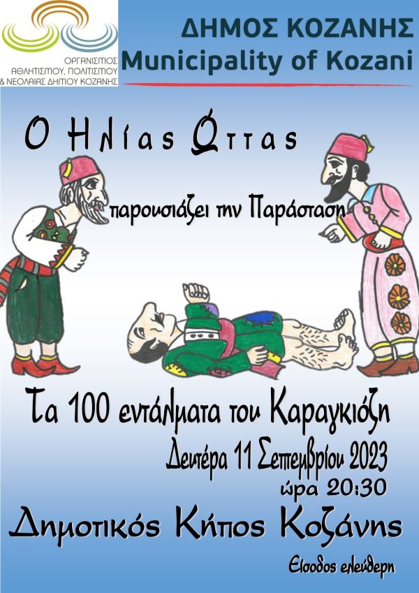 Ούτε ένα, ούτε δύο ούτε τρία, αλλά 100 εντάλματα θα “παραδώσει” ο Καραγκιόζης σε μια μοναδική παράσταση από το Θέατρο Σκιών του Ηλία Ώττα. Η παράσταση που θα πραγματοποιηθεί τη Δευτέρα 11 Σεπτεμβρίου στις 20:30 στον Δημοτικό Κήπο τελεί υπό την αιγίδα του Οργανισμού Αθλητισμού, Πολιτισμού & Νεολαίας του Δήμου Κοζάνης. Η είσοδος για μικρά και μεγάλα παιδιά είναι ελεύθερη.