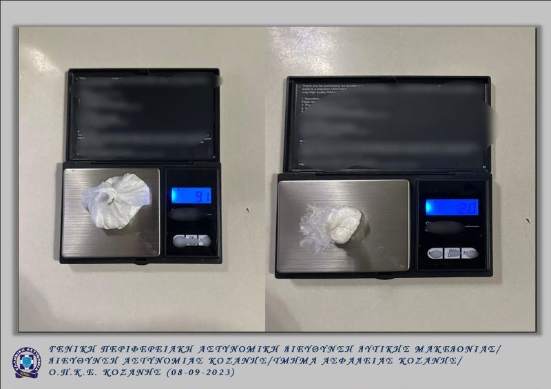 • στην πρώτη περίπτωση, συνελήφθησαν την 07-09-2023 το βράδυ σε περιοχή της Κοζάνης, από αστυνομικούς της Ομάδας Πρόληψης και Καταστολής Εγκληματικότητας (Ο.Π.Κ.Ε.) του Τμήματος Ασφάλειας Κοζάνης, δύο (2) ημεδαποί, ηλικίας 37 και 39 ετών, διότι στην κατοχή τους βρέθηκαν συνολικά και κατασχέθηκαν -2- συσκευασίες που περιείχαν ποσότητες κοκαΐνης, συνολικού μεικτού βάρους -11,1- γραμμαρίων, σύνεργα χρήσης ναρκωτικών ουσιών (-3- καλαμάκια με υπολείμματα κοκαΐνης), δοχείο με υπολείμματα κοκαΐνης και -6- δισκία χαπιών, που εμπίπτουν στις διατάξεις του νόμου περί ναρκωτικών, την κατοχή των οποίων δεν μπόρεσαν να δικαιολογήσουν και