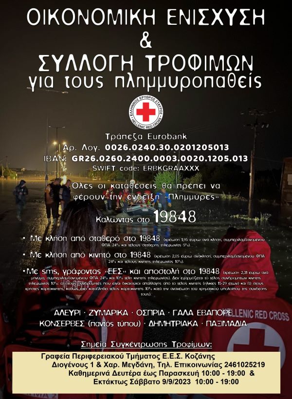 Επιπλέον, ο Ε.Ε.Σ. απευθύνει κάλεσμα στο κόσμο για τη συγκέντρωση τροφίμων μακράς διάρκειας (γάλα εβαπορέ, κονσέρβες παντός τύπου, δημητριακά, παξιμάδια, αλεύρι, ζυμαρικά κ.α.), νερό, μωρομάντηλα, είδη ατομικής υγιεινής για τις πλημμυροπαθείς οικογένειες.