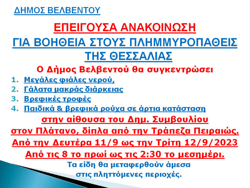 ΓΙΑ ΒΟΗΘΕΙΑ ΣΤΟΥΣ ΠΛΗΜΜΥΡΟΠΑΘΕΙΣ ΤΗΣ ΘΕΣΣΑΛΙΑΣ