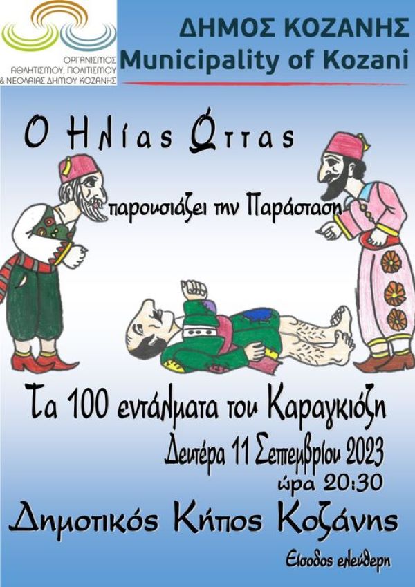 Ούτε ένα, ούτε δύο, ούτε τρία, αλλά 100 εντάλματα θα “παραδώσει” ο Καραγκιόζης σε μια μοναδική παράσταση από το Θέατρο Σκιών του Ηλία Ώττα. Η παράσταση που θα πραγματοποιηθεί απόψε Δευτέρα 11 Σεπτεμβρίου στις 20:30 στον Δημοτικό Κήπο τελεί υπό την αιγίδα του Οργανισμού Αθλητισμού, Πολιτισμού & Νεολαίας του Δήμου Κοζάνης. Η είσοδος για μικρά και μεγάλα παιδιά είναι ελεύθερη.