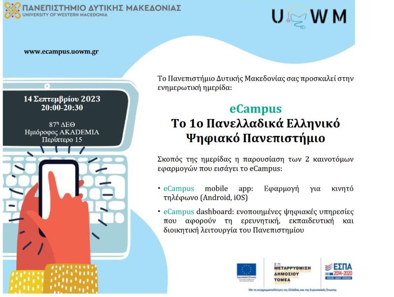 Ενημερωτική ημερίδα με τίτλο: “eCampus  Το 1ο Πανελλαδικά Ελληνικό Ψηφιακό Πανεπιστήμιο” που θα διεξαχθεί την Πέμπτη 14 Σεπτεμβρίου, 20:00-20:30, στο περίπτερο 15 στον ημιόροφο της AKADEMIA, στο πλαίσιο της συμμετοχής του Πανεπιστημίου Δυτικής Μακεδονίας στην 87η ΔΕΘ.