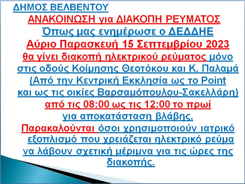Ανακοίνωση του Δήμου Βελβεντού για διακοπή ρεύματος την Παρασκευή 15 Σεπτέμβρη