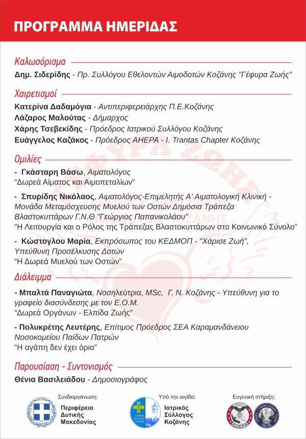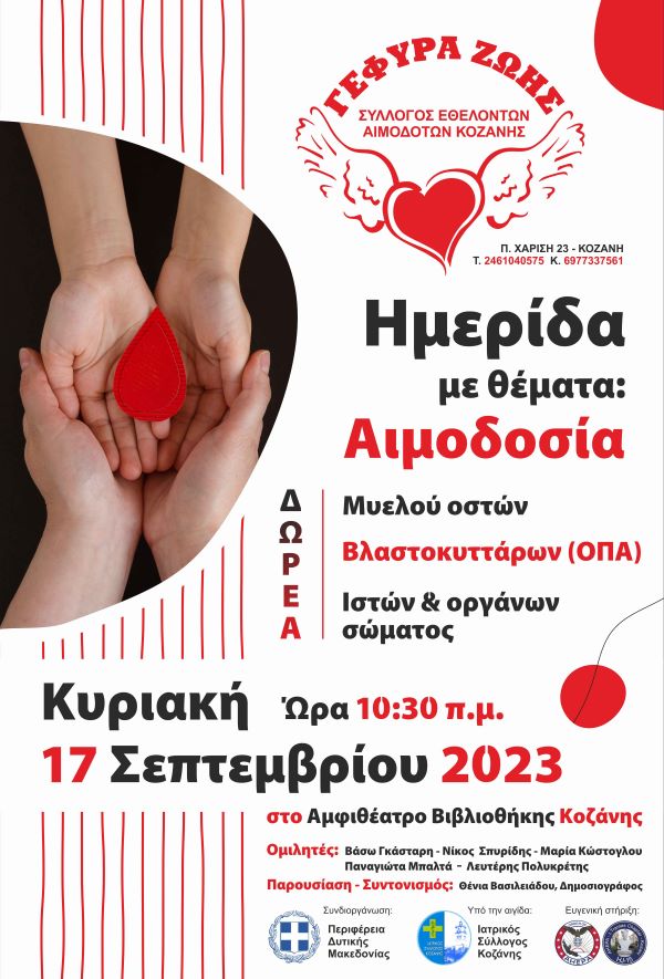 Ο Σύλλογος Εθελοντών Αιμοδοτών ‘Γέφυρα Ζωής’ σας προσκαλεί στην Ημερίδα με θέματα: Αιμοδοσία και Δωρεά μυελού οστών, βλαστοκυττάτρων και ιστών και οργάνων σώματος.