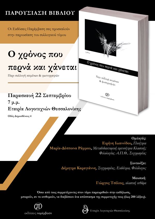 Παρουσίαση του συλλογικού τόμου «Ο χρόνος που περνά και χάνεται» θα πραγματοποιηθεί στην αίθουσα της Εταιρίας Λογοτεχνών Θεσσαλονίκης (Δημοσθένους 4) την Παρασκευή 22 Σεπτεμβρίου, ώρα 7 μ.μ.