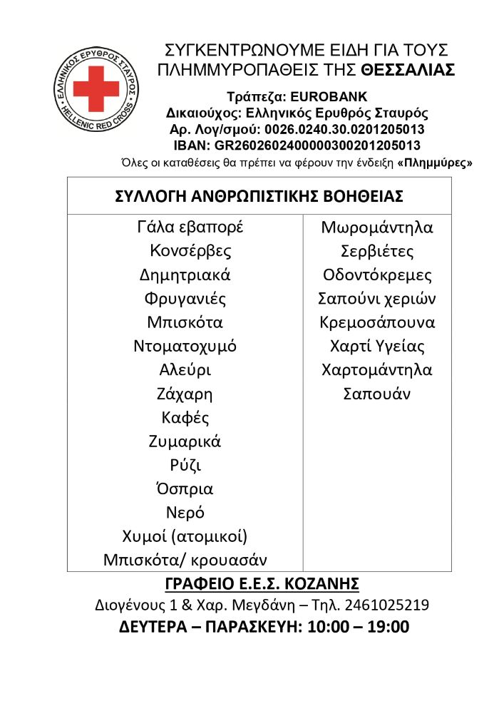 Το Περιφερειακό Τμήμα Κοζάνης ενημερώνει ότι και την επόμενη εβδομάδα 18/9 – 22/9 τα γραφεία θα παραμείνουν ανοιχτά καθημερινά 10:00 – 19:00 για τη συγκέντρωση τροφίμων και ειδών πρώτης ανάγκης που θα σταλούν στις πληγείσες από την πρόσφατη κακοκαιρία περιοχές της Θεσσαλίας. Ευχαριστούμε όλους όσους προσήλθαν στα γραφεία του Ερυθρού Σταυρού όλες αυτές τις ημέρες και στήριξαν τον αγώνα που κάνουμε για την ανακούφιση των συνανθρώπων μας που επλήγησαν.