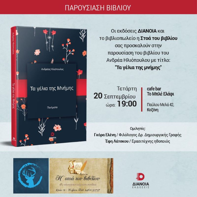 Οι εκδόσεις Διάνοια και το βιβλιοπωλείο η “Στοά του βιβλίου” σας προσκαλούν στην παρουσίαση του βιβλίου του Ανδρέα Ηλιόπουλου “Τα γέλια της μνήμης” την Τετάρτη 20 Σεπτεμβρίου στις 19:00 στο cafe-bar το “Μπλέ Ελάφι” (Παύλου Μελά 42).