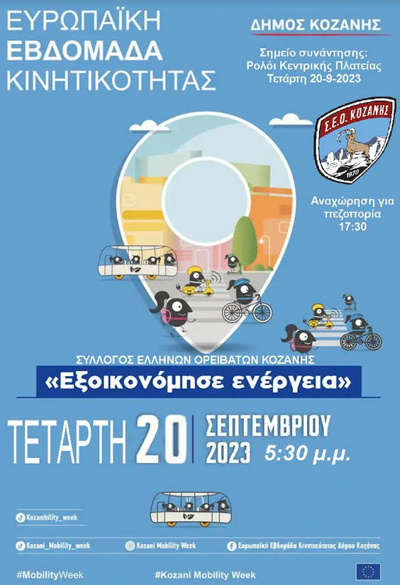 Ο Σύλλογος Ελλήνων Ορειβατών (Σ.Ε.Ο.) Κοζάνης θα συμμετέχει στην ευρωπαϊκή εβδομάδα κινητικότητας την Τετάρτη 20-9-2023 με μία απογευματινή πεζοπορία.