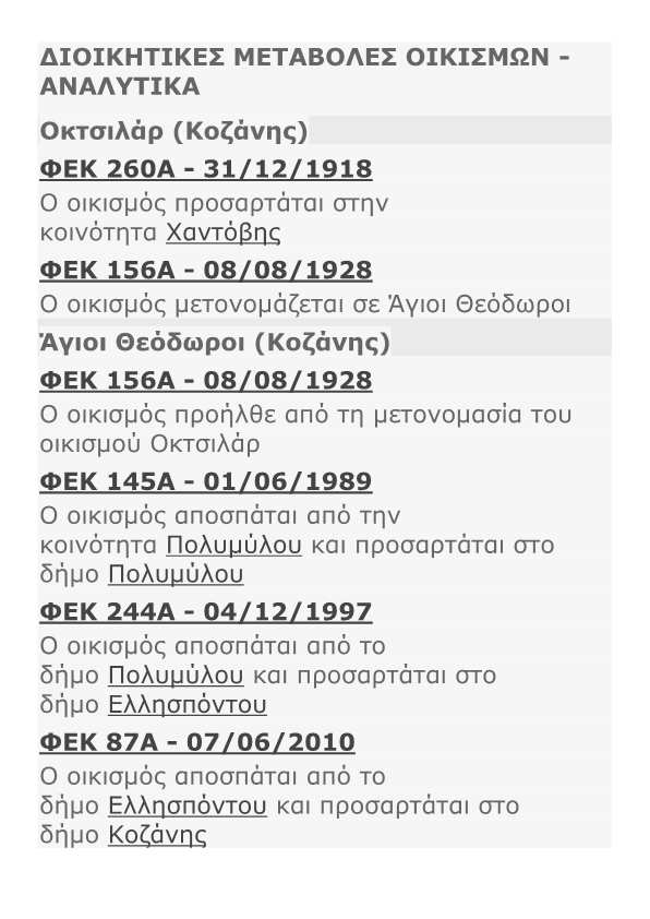 Κοινοτικά: Στις 31/12/1918 ο οικισμός Οκτσλάρ προσαρτάται στην κοινότητα Χαντόβης (Πολυμύλου). Στις 8/8/1928 μετονομάζεται σε Άγιοι Θεόδωροι. Στις 1/6/1989 προσαρτάται στο δήμο Πολυμύλου, στις 4/12/1997 στο δήμο Ελλησπόντου και στις 7/6/2010 στο δήμο Κοζάνης.