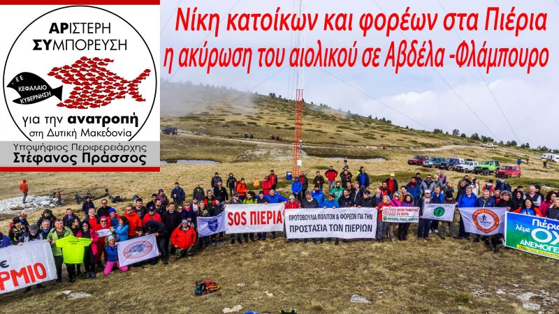 Ακόμα μια μεγάλη νίκη του Κινήματος και των Κατοίκων της Περιοχής Σερβίων Βελβεντού επιτεύχθηκε με την ακύρωση εγκατάστασης 13 ανεμογεννητριών στην κορυφογραμμή των Πιερίων στη θέση «ΣΚΟΤΕΙΝΟ –ΦΛΑΜΠΟΥΡΟ – ΑΒΔΕΛΑ – ΤΟΥΡΛΑ» μέγιστης ισχύος παραγωγής 44,85 MW.