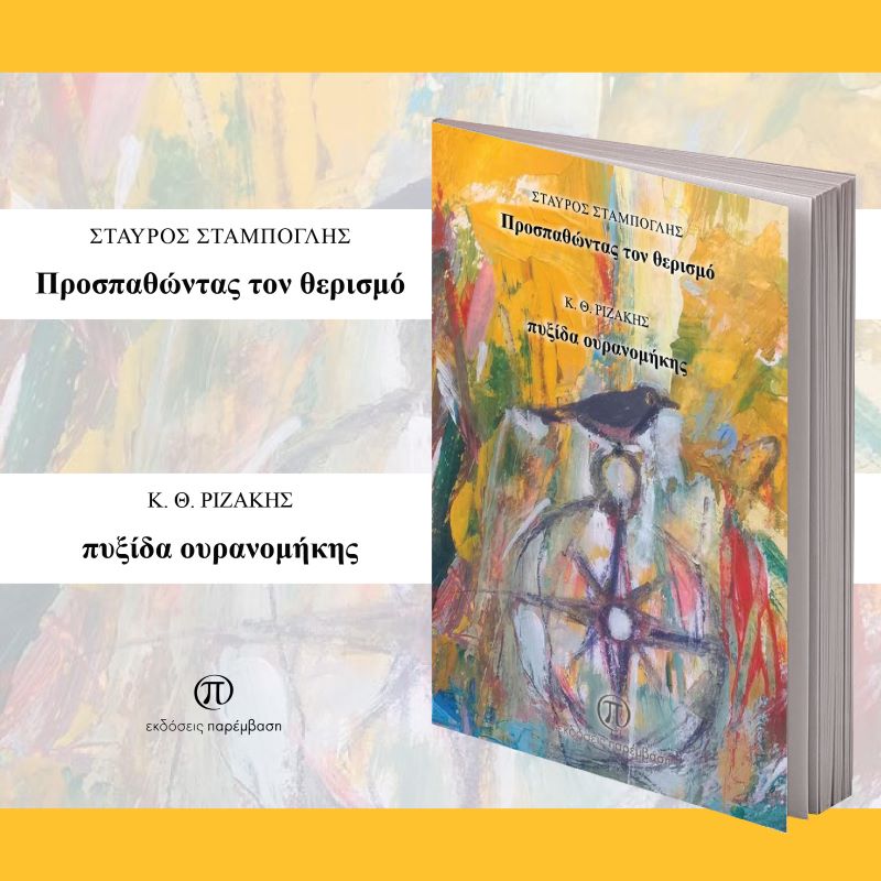 Μόλις κυκλοφόρησε το βιβλίο “Προσπαθώντας τον θερισμό – πυξίδα ουρανομήκης” των Σταύρου Σταμπόγλη και Κ. Θ. Ριζάκη. Πρόκειται για ένα βιβλίο με κοινό παρονομαστή των μερών του την ποίηση του Κώστα Θ. Ριζάκη, αποτελούμενο από μία ποιητική συλλογή του ίδιου αλλά και μια ανάλυση περί της ποιητικής του τέχνης από τον επίσης λογοτέχνη Σταύρο Σταμπόγλη. Ο Σταύρος Σταμπόγλης με τον τίτλο «Προσπαθώντας τον θερισμό» δίνει τη δική του οπτική περί του πώς επιτυγχάνει την ανανέωση στην ποίηση ο Κ. Θ. Ριζάκης, με αφορμή τον σχολιασμό πρότερης ποιητικής του συλλογής, «Η τριμερής σοδειά» (2020). Το δεύτερο μέρος αποτελούν τα δώδεκα ανέκδοτα ποιήματα, ενδεικτικά της ιδιαίτερης και χαρακτηριστικής γραφής του Κ. Θ. Ριζάκη, υπό τον τίτλο «Πυξίδα ουρανομήκης». Υποστηρικτικά στην όλη παρουσίαση λειτουργεί το Επίμετρο με τη μορφή μίας συνέντευξης στις τελευταίες σελίδες του βιβλίου που μαρτυρά, μέσα από τα δικά του λεγόμενα, το πώς διατείνεται περί των λογοτεχνικών πραγμάτων.