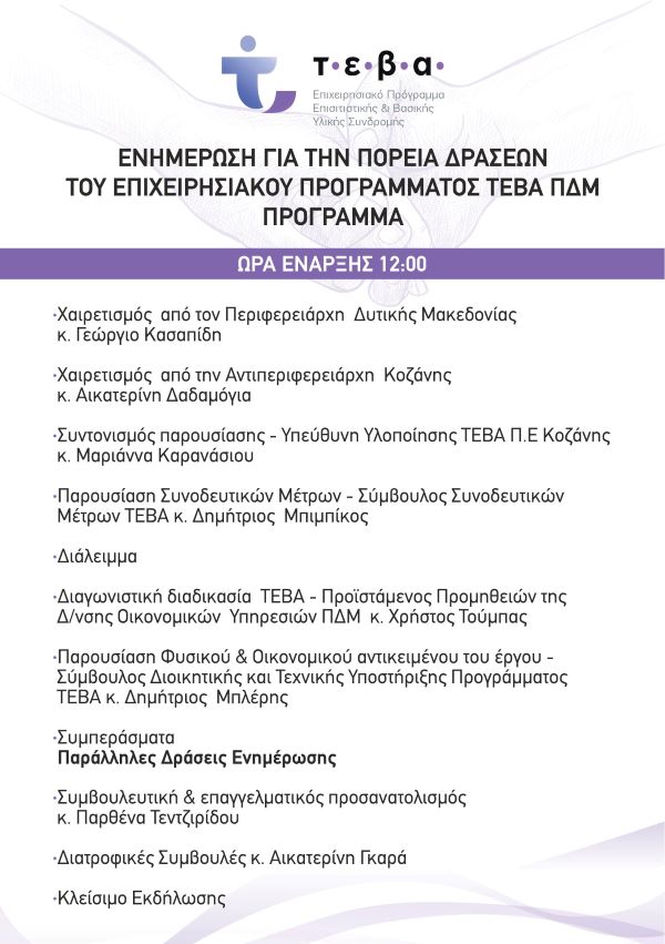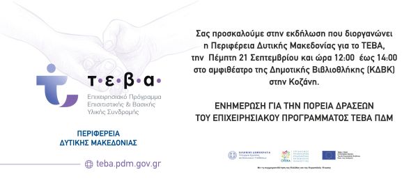 Σας προσκαλούμε στην εκδήλωση που διοργανώνει η Περιφέρεια Δυτικής Μακεδονίας για το ΤΕΒΑ, την Πέμπτη 21Σεπτεμβρίου και ώρα 12:00 έως 14:00 στην Κοβεντάρειο Δημοτική Βιβλιοθήκη Κοζάνης (ΚΔΒΚ) όπου θα γίνει ενημέρωση για την πορεία δράσεων του Επιχειρησιακού Προγράμματος ΤΕΒΑ ΠΔΜ.