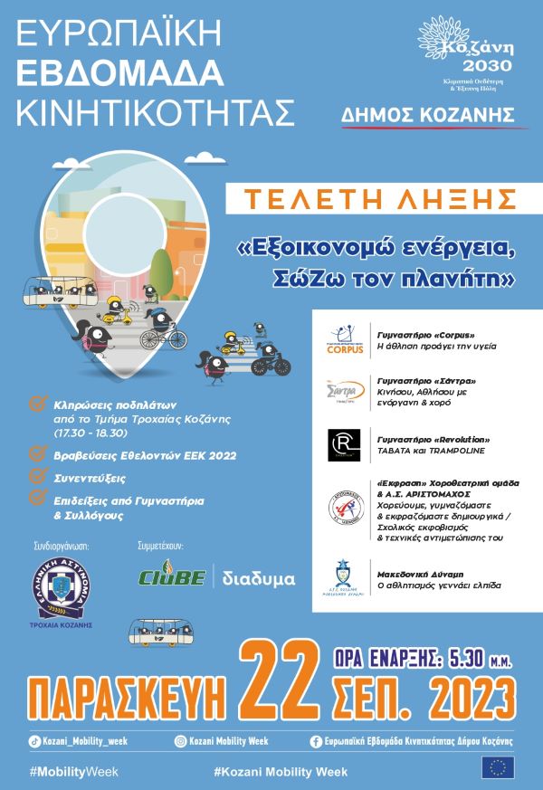 Στην τελική ευθεία μπαίνει η Ευρωπαϊκή Εβδομάδα Κινητικότητας του Δήμου Κοζάνης! Η όμορφη τελετή λήξης «Εξοικονομώ ενέργεια, ΣώΖω τον πλανήτη» έρχεται να «κλείσει» μια εβδομάδα πλούσιων δράσεων, την Παρασκευή 22 Σεπτεμβρίου 2023, στις 5:30μ.μ.