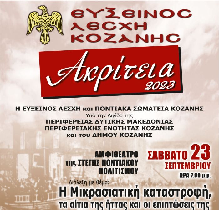 Η Εύξεινος Λέσχη Κοζάνης και Ποντιακά Σωματεία του Δήμου Κοζάνης, σας προσκαλούν το Σάββατο 23 και την Κυριακή 24 Σεπτεμβρίου 2023, στις θεσμοθετημένες πλέον εκδηλώσεις με την επωνυμία “ΑΚΡΙΤΕΙΑ”.