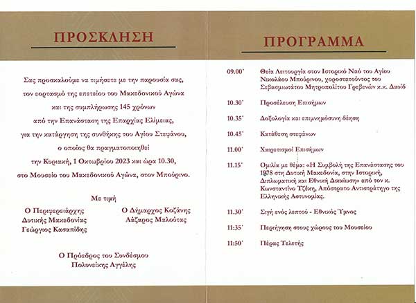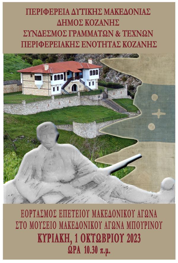 Σας προσκαλούμε να τιμήσετε με την παρουσία σας τον εορτασμό του Μακεδονικού Αγώνα και της συμπλήρωσης 145 χρόνων από την Επανάσταση της Επαρχίας Ελίμειας για την κατάργηση της συνθήκης του Αγίου Στεφάνου ο οποίος θα πραγματοποιηθεί την Κυριακη,1 Οκτωβρίου 2023 και ώρα 10.30,στο Μουσείο του Μακεδονικού Αγώνα στον Μπούρινο.