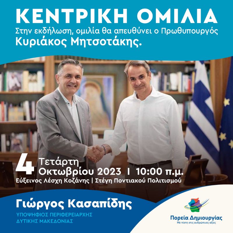 Ο Περιφερειάρχης Δυτικής Μακεδονίας και εκ νέου υποψήφιος Γιώργος Κασαπίδης, επικεφαλής του συνδυασμού «Πορεία Δημιουργίας», θα πραγματοποιήσει προεκλογική ομιλία, παρουσία του Πρωθυπουργού Κυριάκου Μητσοτάκη, στην Εύξεινο Λέσχη Κοζάνης (Στέγη Ποντιακού Πολιτισμού), την Τετάρτη 04 Οκτωβρίου 2023, στις 10:00 π.μ.