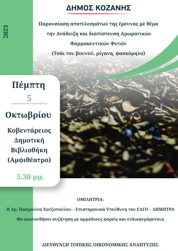 Τα αποτελέσματα της έρευνας με θέμα «Ανάδειξη και διαπίστευση αρωματικών φαρμακευτικών φυτών (τσάι του βουνού, ρίγανη, φασκόμηλο)», θα παρουσιαστούν σε ειδική εκδήλωση, την Πέμπτη 5 Οκτωβρίου, στις 5:30 το απόγευμα, στο Αμφιθέατρο της Κοβενταρείου Δημοτικής Βιβλιοθήκης.