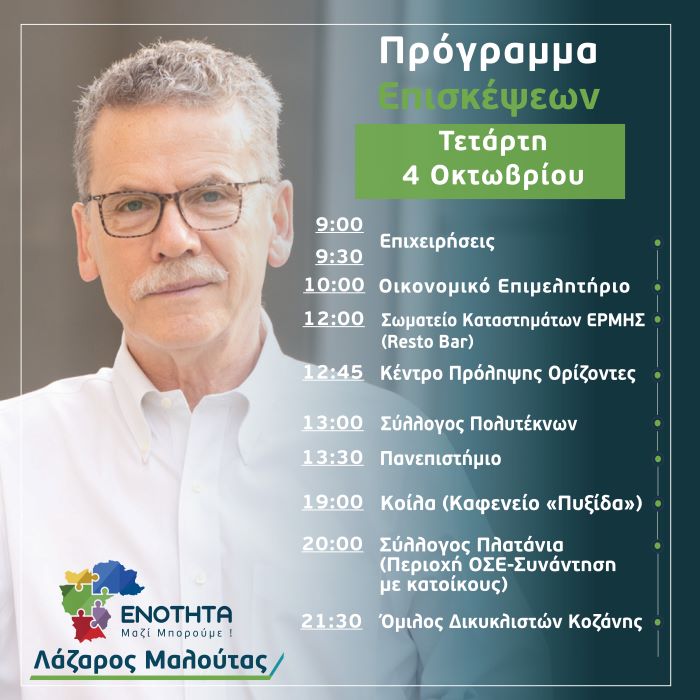 Αυτοδιοίκηση 03/10/2023 Ο Λάζαρος Μαλούτας συναντά τους πολίτες – Πρόγραμμα επισκέψεων Τετάρτης 4 Οκτωβρίου 0 Ο Λάζαρος Μαλούτας συναντά τους πολίτες – Πρόγραμμα επισκέψεων Τετάρτης 4 Οκτωβρίου