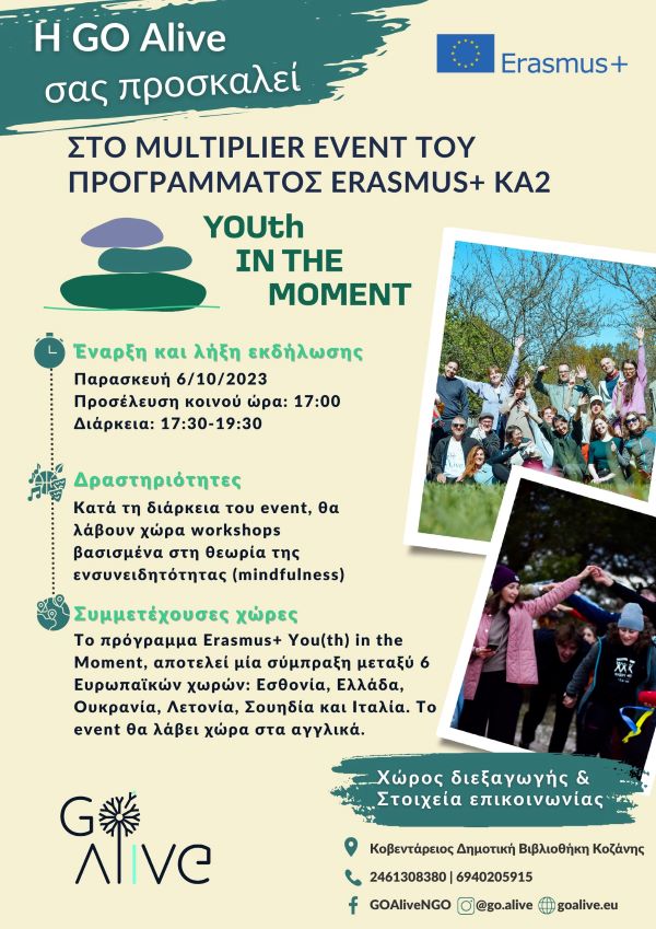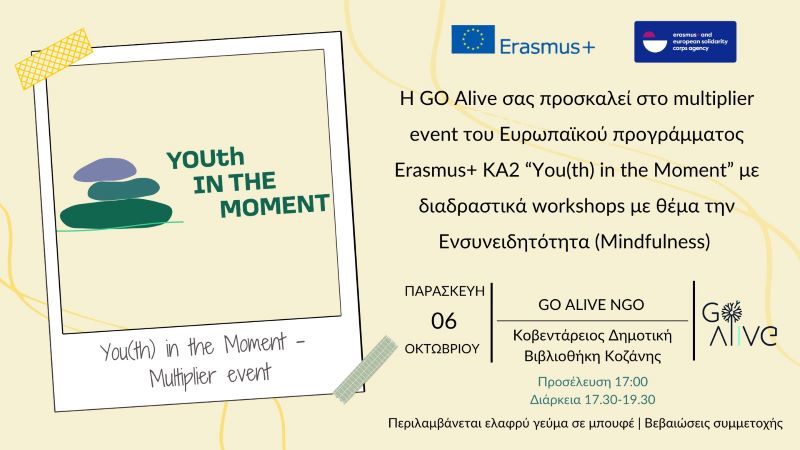 Η GO Alive σας προσκαλεί στο multiplier event του Ευρωπαϊκού προγράμματος Erasmus+ KA2 “You(th) in the Moment” με διαδραστικά workshops με θέμα την Ενσυνειδητότητα (Mindfulness) την Παρασκευή 6 Οκτωβρίου στην Κοβεντάρειος Δημοτική Βιβλιοθήκη Κοζάνης