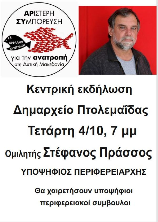 Αυτοδιοίκηση 04/10/2023 Κεντρική προεκλογική εκδήλωση στην Πτολεμαΐδα 0 Κεντρική εκδήλωση στο δημαρχείο Πτολεμαΐδας την Τετάρτη 4/10, 7 μμ Ομιλητής Στέφανος Πράσσος YΠΟΨΗΦΙΟΣ ΠΕΡΙΦΕΡΕΙΑΡΧΗΣ Θα χαιρετήσουν υποψήφιοι περιφερειακοί συμβουλοι