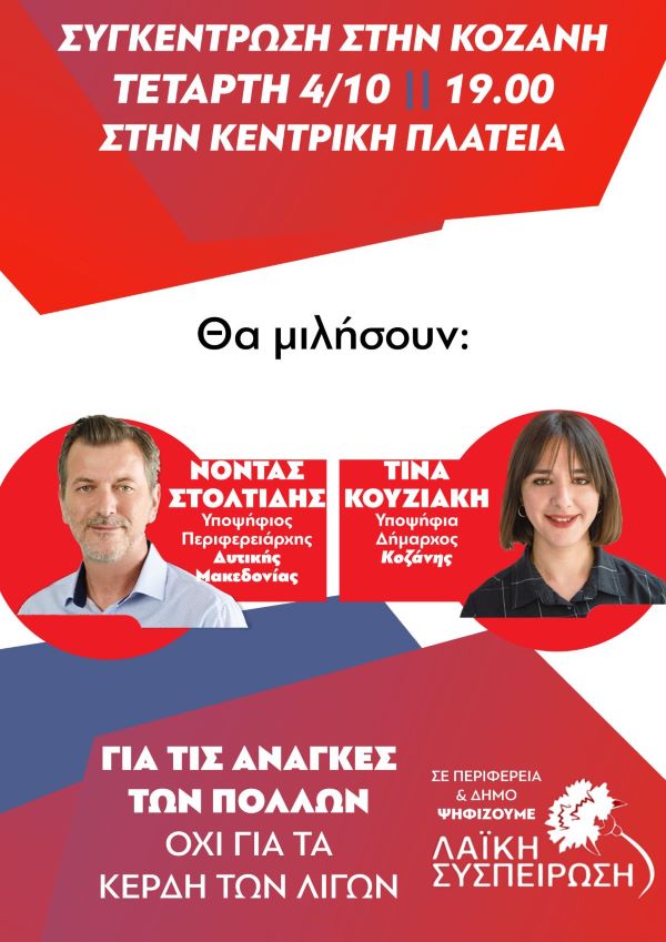 Σήμερα Τετάρτη 4/10/23 στις 19:00 η ΚΕΝΤΡΙΚΗ συγκέντρωση της Λαϊκής Συσπείρωσης ,στην κεντρική πλατεία Κοζάνης
