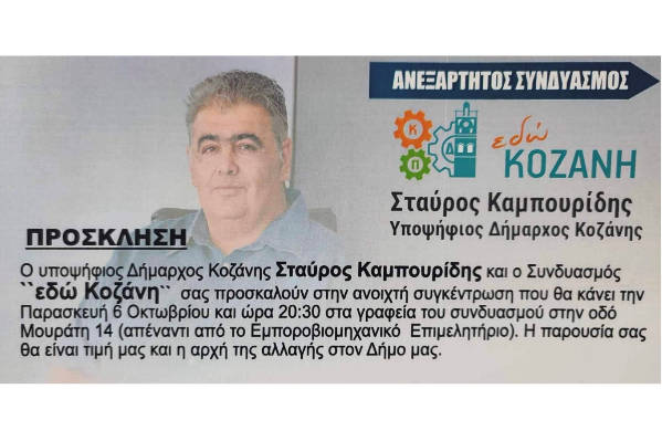 Την Παρασκευή 6 Οκτωβρίου η ανοιχτή συγκέντρωση του συνδυασμού του Σ. Καμπουρίδη «Εδώ Κοζάνη»