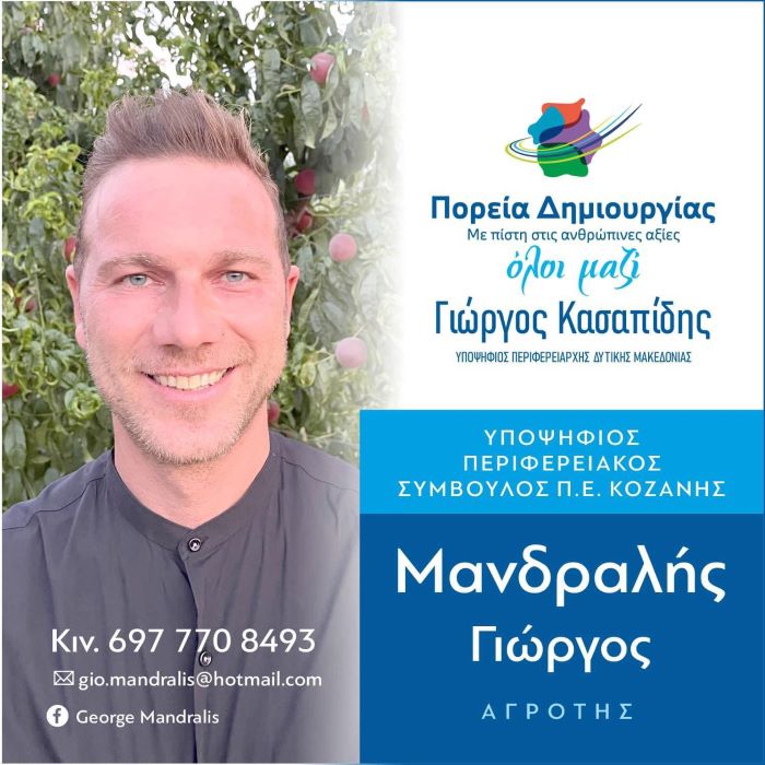 Ονομάζομαι Μανδραλής Γεώργιος, γεννήθηκα στην Ουάσιγκτον της Αμερικής το 1981, και από την ηλικία των 3 ετών ζω στο Βελβεντό Κοζάνης, όπου και τελείωσα το Λύκειο. Ακολούθησαν οι σπουδές μου στο ΙΕΚ ΠΑΣΤΕΡ, ως φυσικοθεραπευτής κι αφού ολοκληρώθηκε και η στρατιωτική μου θητεία, αποφάσισα να επιστρέψω στο Βελβεντό και να ασχοληθώ με την καλλιέργεια των ροδακίνων.