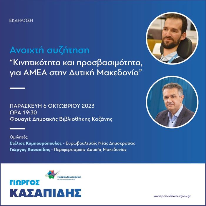 Αυτοδιοίκηση 06/10/2023 “Πορεία Δημιουργίας” – Ανοιχτή συζήτηση: Κινητικότητα και προσβασιμότητα για ΑΜΕΑ στην Δυτική Μακεδονία 0 “Πορεία Δημιουργίας” – Ανοιχτή συζήτηση: Κινητικότητα και προσβασιμότητα για ΑΜΕΑ στην Δυτική Μακεδονία.